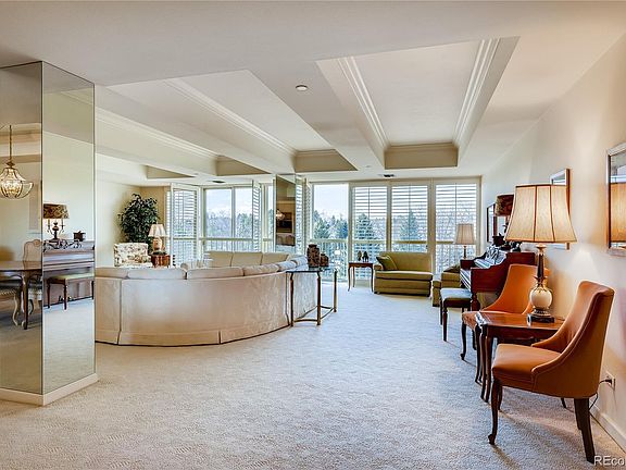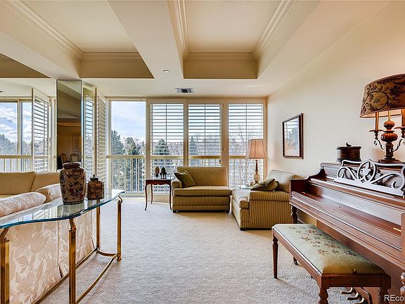 Elegant south facing unit of 2390 square feet with floor to ceiling windows overlooking acres of manicured landscaping, ponds, waterfalls, trees and stunning mountain views. Lovely parquet wood floors, plantation shutters, crown molding, coffered ceilings, wet bar and spacious rooms. Gracious living and beautiful appointments. Impressive entry with Deco French doors into Great Room and dining area. All appliances included in kitchen with upgraded lighting and large eating nook. The two bedrooms and full baths could be dual masters or an office/den. Nice storage in Laundry room. There are two deeded parking spaces and large storage unit. Fitness Center with indoor/outdoor pool, hot tub, steam rooms, racquetball courts, picnic area with grill and party room with kitchenette. Grand Salon with peaceful north facing large brick patio and guest suites also available. Waterford is a great living experience with 24/7 manned front door. Three elevators. Cherry Creek schools. Pet free building. Underground garage is heated and well-lit. Live like being on a vacation every day.