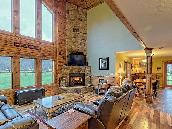 Beautiful Craftsmen style home on a 5 acre tract of Hiawassee River front, an orchard of fruit trees & garden spot. Home features open floor plan with large living room, spacious kitchen, pantry, exceptionally beautiful hardwood floors, rock fireplace (from floor to cathedral ceiling) natural lighting with windows to enjoy the spectacular year round pasture, creek and mountain views. Master suite, is everyone's dream: king sized bed, & still room for dresser, night stands, etc. Spacious laundry on the main,& half bath. Two nice sized bedrooms upstairs with loft for office, den, etc. & full bath. Over sized garage w/2 BR's, Jack & Jill Bath over garage for total of 5 BR's. Not included in square ft. on MLS. Front porch for southern exposure, screened in porch on the East side to watch your garden grow & animals play. Barn is 2 story for storage, tools, boat, ATV, camper. This property is a rare find and want last long.