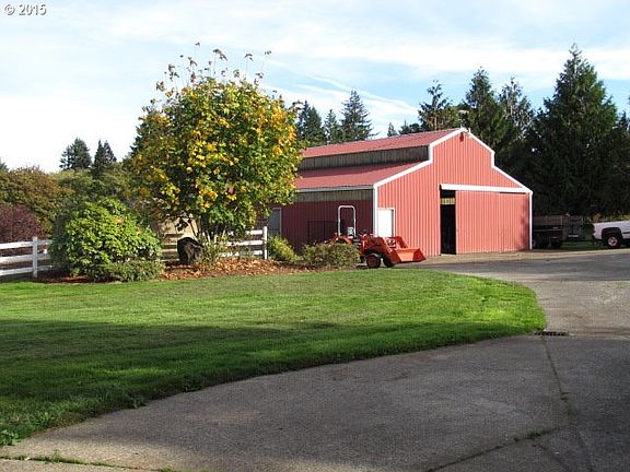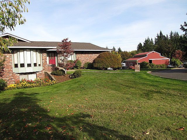 Gentle rolling green pastures meet small town Ridgefield. Red Barn 48 x 39 w/ concrete flooring & stalls ready & waiting. Gated entrance; paved circular drive plus RV, tractors & toys parking. Custom home w/ Hardwood flooring; 5 bdrms, 3 1/2 bths. Walls of windows to Mt views. Island kitchen; pullout custom cabinets. New deck & gardeners yard. See detailed feature sheet. Short walk to town or nature preserve. Land is sub-dividable too!
