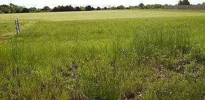 Gently sloping open building lot with mature trees along front. .