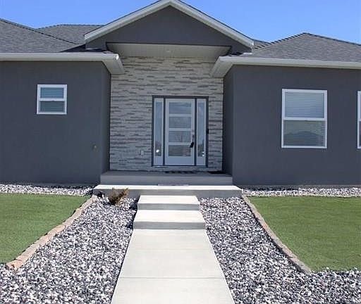 Fabulous 1 level home in Top Rail Ranch Estates on 2.4 acre corner lot!! 3-bedroom, 2-bathroom home with low maintenance storm grey stucco and vinyl soffits. 3 car attached garage. Open floor plan with large island & bar. Dining and Kitchen areas have Life Proof vinyl planking. Spacious primary bedroom has a huge walk-in closet and adjoining 5-piece bath with free standing soaker tub, glass inset walk in shower, linen cabinet, over counter cabinet and cosmetic cabinet make for plenty of storage. Kitchen with plenty of cabinet space, including Aristokraft cabinets from Colorado Cabinet Works, crown molding, under cabinet lighting, Kenmore stainless steel appliances which include gas stove, quartz countertops with 3 inch quartz backsplash and adjacent pantry. Main dining area has a slider with built in shades to covered concrete patio. Big bonus area with island that can easily accommodate 6 bar stools and a coffee bar that includes wine rack. Island and bar area also have quartz countertops Other amenities include central air, 5 panel doors, ceiling fans in all bedrooms and living room, an abundance of can lighting, cultured marble window seals, finished insulated garage and Rinnai tankless water heater. 2nd bath also has double sink vanity, tile floor and linen closet. Also some artificial turf, salt and pepper rock and circular driveway enhance the exterior of this home. Blinds were professionally installed. Big laundry room has cabinets over the Maytag washer and dryer.
