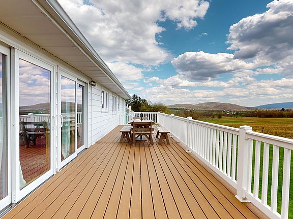 At days end, unwind in the entertainment area playing games with the kids. For those chilly winter nights, a wood burning stove adds a cozy touch. Step outside onto the deck and immerse yourself in the breathtaking scenery that surrounds the property. Whether savoring your morning coffee or hosting a summer barbecue, the outdoor space is an ideal retreat for alfresco living.