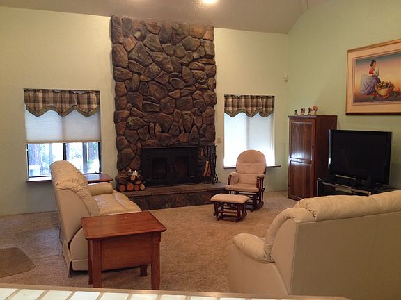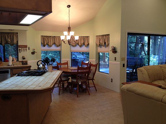 This Solid Built Custom home Features a Gourmet Kitchen with Newer stainless steel appliances an open flow to your living room and adjoining covered patio area enter the home through the vaulted entrance with lots of custom windows for natural light flowing in the three bedroom, three bath Open concept offers the perfect size for a family some of the great features included are the floor to ceiling stone fireplace . The Master Bathroom offers an on suite master bath with sunken jetted tub and tiled shower and large walk in closet , your master bedroom opens to a private deck to enjoy your morning coffee and newspaper . The Property is Fully fenced with chain link that is hidden in the trees. Extra deep Three car Garage.