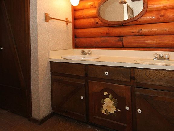 Warm/Charming w/log walls/wood ceilings/2.5ac m/l; 2bd,2ba down/1bd/half ba up (cb gamerm), TWO spaces up for expansion/wtr filter/washer/dryer/fridge/2 HW htrs/HVAC 2011/BIG POND,NEW carpet/corner lot/circle drive/FISHER wood stove/open flr plan.