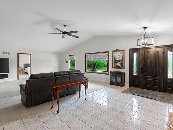 Over 2300 square foot ranch style home situated on over four acres of ground. Perfect for an individual in need of work space and storage areas without leaving home. Self-employed individuals in the lawn care business, electrical or plumbing trades, etc. may find it most accommodating! Features include a split, 400 amp electrical service with outbuildings, private pond with fountain, fenced rear yard, and attached garage capable of parking as many as five autos. Interior features include 6 panel stained wood doors, wood double hung insulated dual pane windows, vaulted family room ceiling, tile flooring in foyer, kitchen, & dining area along with a main floor laundry room. Recently renovated primary bedroom, bath and kitchen. This property has excellent promise for small business owner in need of workshop, room to park equipment, a good location and easy access to Interstate 44 or Hwy 100.