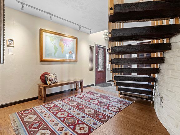 One of a kind pueblo-style custom home, located at the base of the Sandia Mtns just a block from Open Space trails, sits on a large .23-acre corner lot. The unobstructed mountain and city views will take your breath away.This 2419sqft home features 4 bedrooms with tile and engineered wood floors throughout. The bright, round living room with raised wood-beamed ceiling and wood-burning fireplace is great for entertaining. The kitchen offers updated appliances, beautiful granite countertops, and opens to the dining room. Spacious primary BR features a large walk-in closet, wood-burning fireplace & great views to the west. The walled backyard includes a secluded gazebo shaded by mature vines, terraced gardens,vegetable patch, grape arbor, & a gated RV pad.