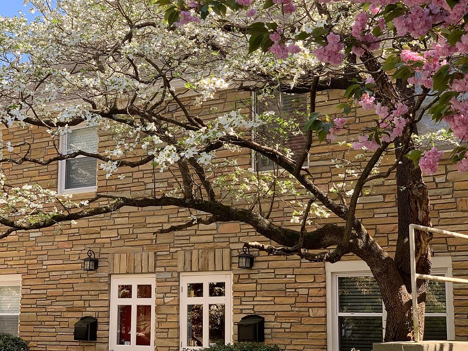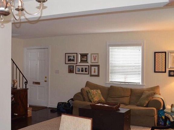Cameron Village townhome with beautiful, natural stone exterior, 2 bedrooms, 2 full baths, unique open floor plan, living room/dining room, new kitchen opens into dining area , den/study, large coat/storage closet near front entrance, separate laundry room with full-size washer and dryer and laundry sink, new storm windows, 2-inch blinds, and attic storage. End Unit. Unique townhome with den/study and separate laundry room. Water, garbage/recycling and landscaping are included in rent. The kitchen (designers' renderings of new kitchen included with photographs) has new cabinets with soft-close doors and drawers, new ceramic tile, new under-cabinet lighting and new recessed lighting, 20 cabinets, a combination of 15-inch and 28-inch drawers, a double sink with single-handle, pull-down sprayer kitchen faucet, ceramic, smooth-top range, disposal, dishwasher, refrigerator, and new brushed nickel hardware. The den/study has double windows, a large closet, and access to expansive backyard with azaleas and crepe myrtle trees. The carpet has been removed in the two upstairs bedrooms and replaced with newly refinished hardwood floors. The upstairs bathroom has a tile floor, pedestal sink, and floor-to-ceiling bathroom cabinets. All interior doors have brushed-nickel handles. An illustrative floorplan is included with the photographs of the property. Small dogs are allowed with payment of non-refundable pet fees. Listed by owner/broker. Application fee is $40.00 per person. No administrative fee. Townhome is available July 9, 2018. For additional information, please text or call 919-821-2299. Water, garbage/recycling and landscaping are included in rent. Small dogs are allowed with payment of non-refundable pet fees.