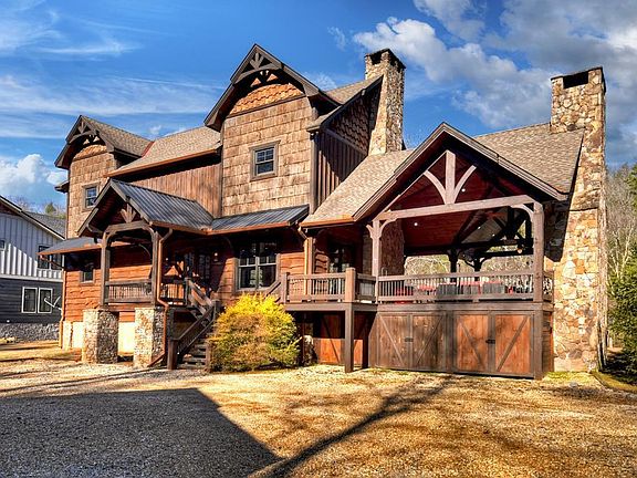 An exceptional, one-owner custom riverfront retreat on the coveted lower Toccoa River, offering approximately 150 feet of wadeable trout fishing frontage. This thoughtfully designed home blends refined mountain elegance with luxury craftsmanship, framed by expansive windows capturing tranquil river views. The main level is ideal for entertaining, featuring a chef's kitchen with oversized island, extensive custom Maple cabinetry, Viking appliances, beverage cooler, and a fully appointed bar with two Scotsman ice makers and an additional beverage cooler. The kitchen flows seamlessly into the living room anchored by a dramatic stone fireplace. A guest bedroom is conveniently located on the main level, along with a nearby full bath offering a tile shower, garden tub, and option for a stackable washer/dryer. Upstairs, a private guest suite includes an en-suite bath with tile shower, garden tub, and double vanity. Just down the hall is a dedicated laundry room. The primary suite is a true sanctuary with soaring ceilings, stone fireplace, private coffee bar with refrigerator, walk-in closet, and a luxurious bath featuring a walk-in rock waterfall shower, garden tub, double vanities, sauna, and generous custom storage. Additional highlights include a whole-house water purification system, tankless water heater, and whole-house generator. Outdoor living is elevated by a grand covered party porch with real wood-burning masonry stone fireplace, just steps from the river's edge. The property also features a private dock, built-in kayak and canoe storage beneath the home, and a detached two-car garage with mini-split system and separate workshop. Located in a private neighborhood with paved roads, just minutes from downtown Blue Ridge , close to shopping and dining !