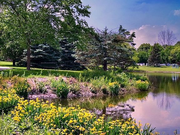 Wow! Where can you live and be surrounded with such beauty for such an affordable price? Updated, main level condo w/nothing behind but endless gorgeous, wide open green space, walking trails & lake! Owner paid 83K & invested ~15K in additional improvements. Repl.windows, HVAC, stainless appl. & washer/dryer. Popular open layout w/impressive solid surfaces through out. Stylish kitchen backsplash, ceramic tile flrs, bath walls & custom tile shower. Just prof.painted in current grey/whites.Brand new sliding barn style door to bath, raised panel sliding closet doors & carpet in both BR. Master w/2 closets & plenty of space for a king bed. Walk right out back to your private, enclosed,covered patio to scenic views & direct access to park/lake. (unlike many condos w/views only of parking lots/bldgs) $188 mo.fee includes water, sewer, trash, lawn care, snow removal, exterior maintenance, designated parking, use of the pool, tennis courts & club house. Why rent? This one is priced to sell!