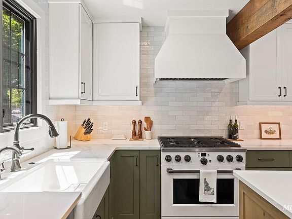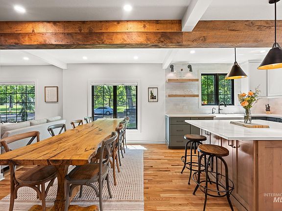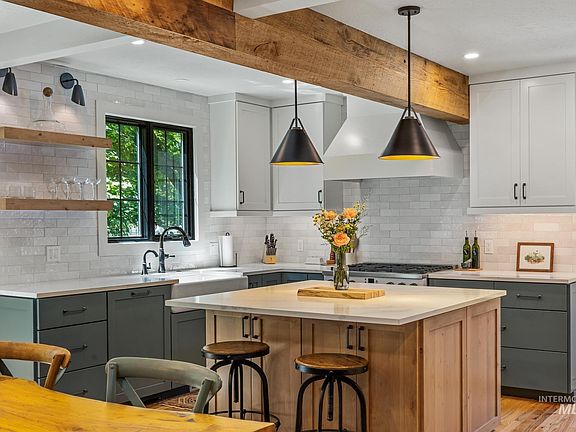 Positioned across from Elm Grove Park and reimagined by renowned We Three Design, this home preserves historic character with elevated living. The living room is anchored by a wood-burning fireplace, painted brick hearth and rustic mantel beam. A white oak island lends natural warmth, topped in quartz. The slate-blue base cabinets blend elegantly with white uppers, the hand-glazed tile and matte black fixtures add richness. Open wood shelving, artisan lighting, and a reclaimed beam overhead complete the space. The main level suite offers a serene sanctuary with a beautifully appointed bath and walk in closet. The ensuite features a dual vanity, zellige tile, and spa-level shower. The jewel-box powder room adds some whimsy. Downstairs has two guest/flex rooms, and stunning full bathroom, laundry, and storage space. The 2 car garage/shed is rare. The epitome of North End living: leafy morning walks, afternoons in a Gold Feather Garden, and an address woven into the fabric of Boise’s most cherished community.