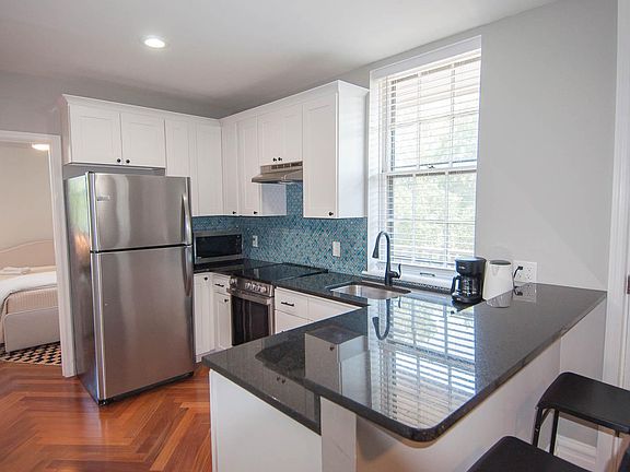 Granite countertopsNew shaker cabinetsAdditional storageLarge closetHerringbone hardwood floorsBreakfast barIn-unit laundry