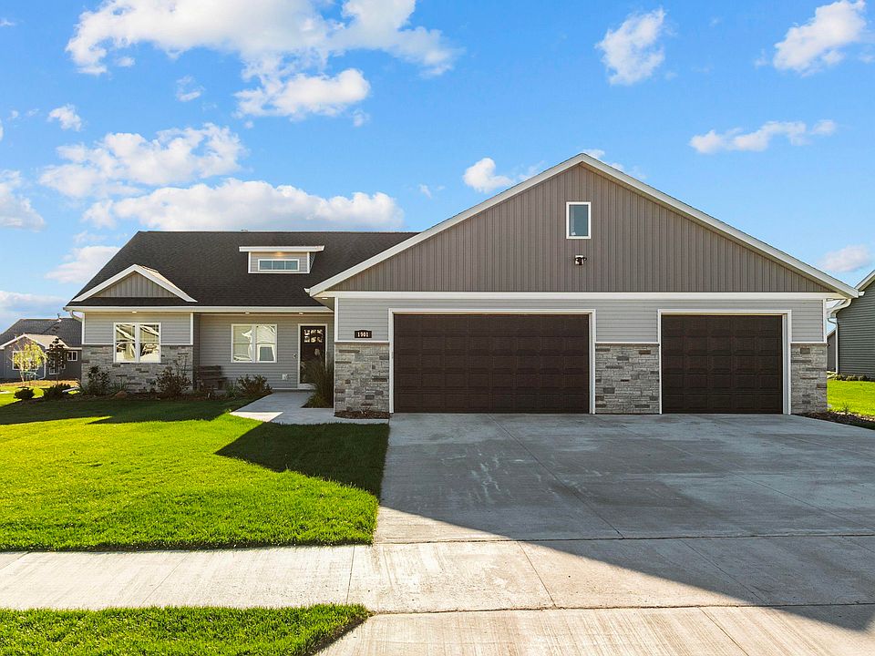 This stunning split bedroom ranch welcomes you from the moment you open the front door. The open concept kitchen, dining, gathering room w/gas fireplace is the perfect space for large or small gatherings. The oversized master suite features a wood accent wall giving the warm cozy retreat. The large master bathroom w/dual sinks, W.I. tile shower and a W.I.C. The 1st floor laundry is located right off the garage. The extra large, 6 car finished heated garage features an overhead door to the back yard & stairs to the basement. The basement is partially finished w/a bedroom, oversized full bathroom & a huge rec area for entertaining. This newer construction has a covered front porch w/beautiful landscaping, concrete walkway and driveway. Outside a covered concrete patio perfect for grilling.