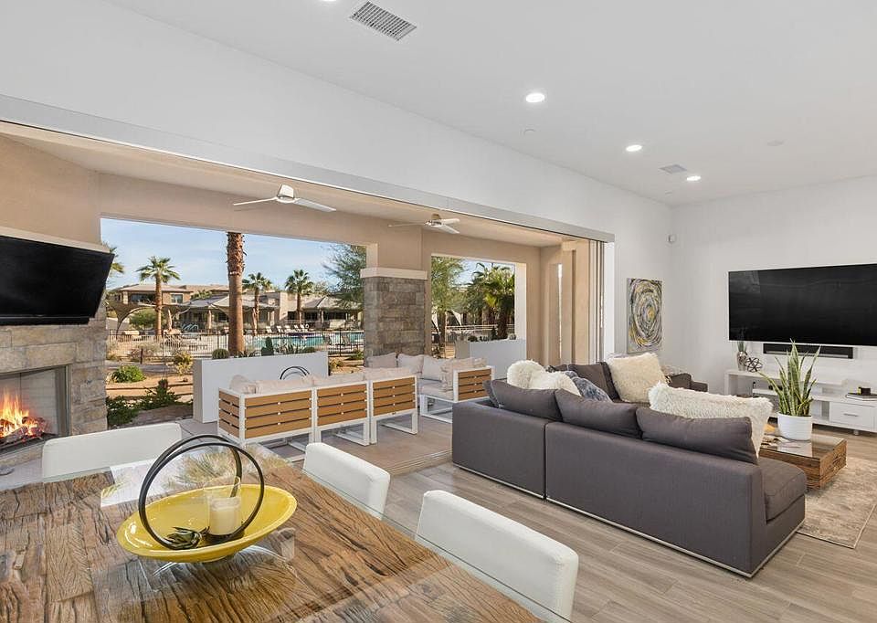 Buyer could not perform. Their loss is your gain! Newer construction and move in ready 2-bed plus den, 2.5-bath villa in The Retreat at Desert Willow. Perfect for discerning homebuyers, the contemporary design boasts quartz countertops, walk-in showers, shaker cabinets, and wood-look plank tiles. Newer construction prioritizes energy efficiency with smart home features like Nest Thermostats. Custom additions include automatic window shades, Bosch appliances, Toto NeoRest toilet in primary bath, Sonos system, and LED lights. Entertain effortlessly with an upgraded sliding glass wall leading to a patio with a gas fireplace. Ideally located near the pool and clubhouse, the property offers easy access to I-10, Acrisure Arena, and El Paseo. Enjoy resort-like amenities and membership perks at The Desert Willow Golf Club. Offered furnished, this property provides an unparalleled living experience. HOA covers cable, internet, water, pools, fitness center, spa, and clubhouse. View attached documents for comprehensive HOA benefits.
