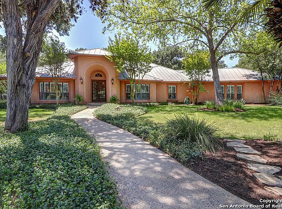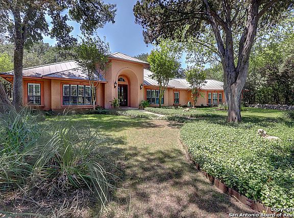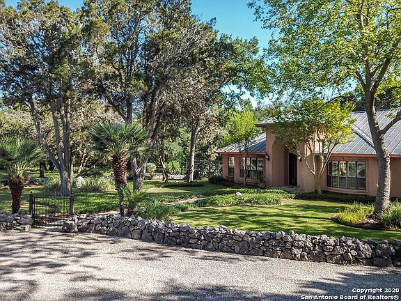 We are excited to present to you this rare opportunity to own your next home within the unique & exclusive private Guadalupe Riverfront property in desirable Riada gated community. Homes in the Riada neighborhood rarely become available. Homes that are on the river, even more rare. This immaculately maintained home features an open floor plan with the convenience of single story living. Situated on 7 park-like acres, the grounds are filled with mature oak trees framing the home built high above the river on level ground. The driveway features a dedicated address monument that sets the tone as your visitors amble down the long drive, enjoying the trees, wildlife and scenery with plenty of parking in the circular drive as well as pad parking out front. This single story home is built to take in the views of the grounds, patio and pool area with the river and limestone bluff in the distance. As you enter the home, you will be greeted by a large welcoming foyer overlooking the formal living with the pool and river in the background; nothing short of stunning. Four bedrooms, three full baths, two living spaces and large kitchen provide ample and comfortable living. The kitchen features a den for additional easy living. Attached three car garage includes space for a golf cart and plenty of storage. Access to the river is a quick stroll down the back side of the property or hop in your golf cart and enjoy the amenities of the private neighborhood park that borders this home on the north side of the property line. Riada is within two miles of Gruene, TX, which is bustling with activity on the weekends and boasts plentiful boutique shops and dining options just minutes away. This home is only a few miles to Interstate 35 and the Creekside Shopping area with its H-E-B Plus, Buccee's, shopping & restaurants. If you have been looking for a low maintenance wild-scape planned acreage homesite with many native plants along with complete privacy on the clear and beautiful Guadalupe River that's designed for gatherings or entertaining, you have found your next home!