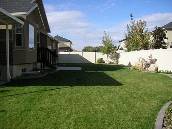 Large kitchen, knotty alder cabinets, solid surface countertops, stainless appliances. Huge family room down, two more on main level. Like-new condition. Enjoy shade of east facing covered patio.