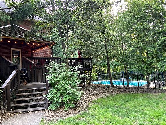 Gorgeous Colonial home in a beautiful country setting on 1.6 acres with mature trees, manicured lawn, covered deck with cedar pergola to side of home, spacious 3-car garage with new doors, and inground pool perfect for entertaining guests. Wrap around porches on both levels to enjoy the seasonal weather and enjoy the many sounds of nature. Original woodwork throughout, crown molding, poplar wood flooring on main level, built-in cabinetry and dining hutches for your fine china, formal dining, and elegant kitchen with Corian countertops featuring stainless- steel appliances close to side door entrance. Main level offers study, full bath, and large living area. Upper level provides primary suite with large walk-in closets, jetted tub, and separate powder area. Two generous sized additional rooms and full bath complete the upper level with whole house attic fan and pull down attic access to storage. Walk-out basement is perfect area for family and friends providing full service bar, surround sound system, built-in desk, ample amount of storage, full bath perfect for pool guests, and spacious lower level bedroom with double closets. Utility room completes basement. Lots of room to relax or entertain!