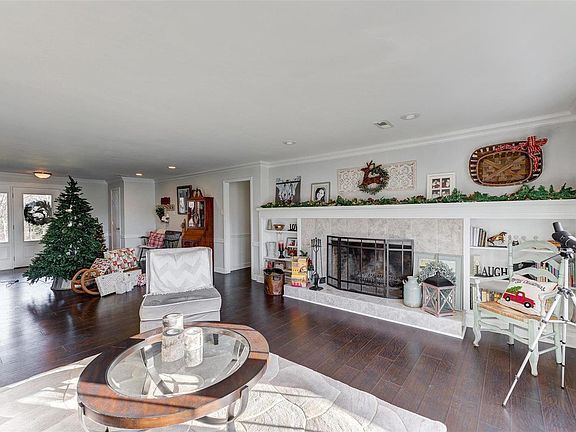 with full masonry freplace fanked by bookcases. Charming dining room opens to a cozy hearth room with second wood