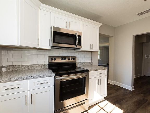 Newly remodeled home on over half an acre conveniently located in North Lakeland! In addition to being on a large lot, this home also boasts a huge workshop (800 sq ft) perfect for storage and working on projects. The interior of this home features a brand new kitchen with new countertops, cabinets, and stainless steel appliances, updated bathrooms with a barn door, all new fans and light fixtures, new flooring, built-in shelving, new A/C and newer windows allowing for lots of natural light. The exterior of this home features a back porch that looks over the half an acre of fenced-in land and huge workshop. This property has mature trees as well as fresh landscaping around the house.