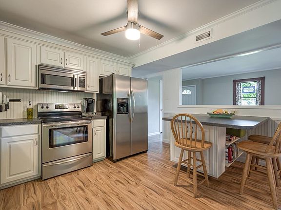 Tastefully updated one story home with open floor-plan just 15 minutes to Downtown Durham. Kitchen features stainless steel appliances, formal cabinets topped off with crown moldings, and a bead board backsplash. Don't miss the built in peninsula island/breakfast table with drawers for extra storage, and a walk in pantry/utility room. Step out the backdoor and relax on the covered back porch overlooking the spacious backyard. Floors are site finished hardwoods in the living room addition which has the feel of a sunroom featuring a vaulted ceiling and walls of windows. Both bathrooms have been updated with quartz countertops and the owner suite bath features a walk in shower with custom tile work. Fenced area in backyard plus a detached shed for storage. Well maintained and updated - Laminate Floors 2023 MasterBath 2021 Roof 2020 Heat Pump 2018 LR Sunroom Addition 2002