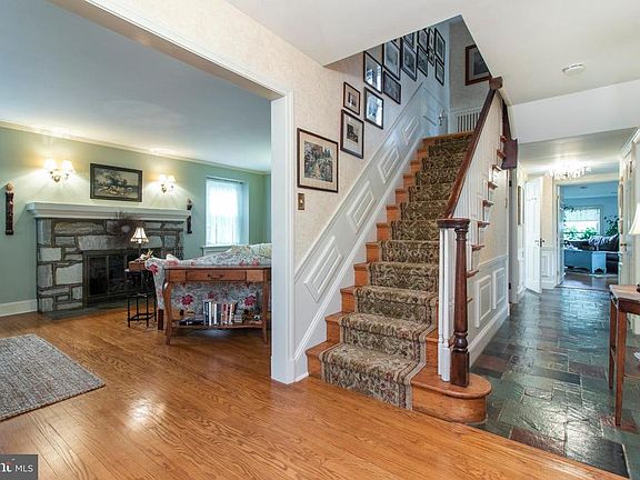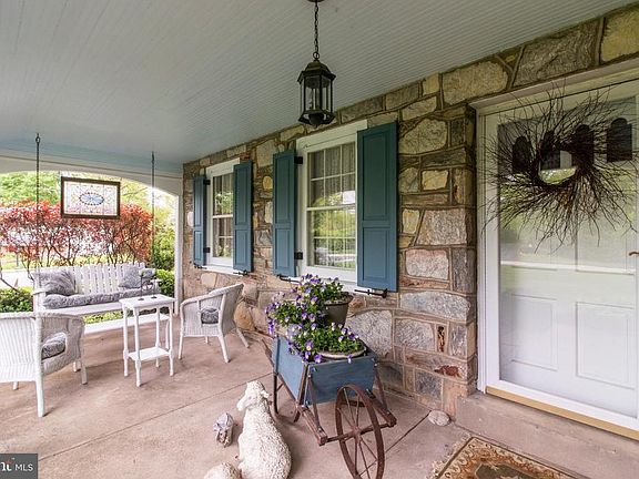 Charming Center Hall Stone Colonial with slate roof on a level, corner lot with a large private driveway and a detached 2 1/2 -car garage. Walk up to the covered front porch that leads into the inviting foyer with hardwoods and custom millwork and mouldings that continue throughout. The formal living features 5 deep sill windows and is warmed by the stone fireplace with custom wood mantel accented by lighted wall sconces. The dining room creates a perfect ambiance for entertaining guests with a beautiful chandelier and large walkout bay window. The hallway off the foyer gives access to the updated full bath with stall shower and modern vanity plus a bonus den/parlor that is a perfect place to curl up with a book. The updated, eat-in Country Kitchen features granite countertops, an abundance of white cabinetry, and an eating area with a dramatic light fixture. You will love walking upstairs to the charming oversized hallway featuring another exquisite chandelier with access to the rooftop deck overlooking the peaceful yard. All three spacious bedrooms offer hardwood flooring, ample closet space and access to the tiled hall bath with double bowl vanity. The rustic, walkout finished basement adds wonderful living space with pool table (yes! It~s included), bar seating and recessed lighting. The property truly provides a beautiful oasis with lots of landscaping with hardscape accents; large tree with tree swing; two adjacent patios (one paver, one slate), plenty of yard space and a shed providing additional storage separate from the garage. Some other great features include: Slate roof, gutter guards, Well built with 19-inch walls, high velocity C/A, newer furnace and oil tank (3 1/2 yrs old) and much more.