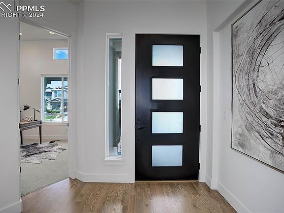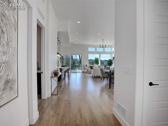 In the esteemed Flying Horse community, this architectural gem offers unparalleled luxury & convenience. Professionally designed landscaping features a drip irrigation system, LED lighting, artificial turf, & perennial gardens, creating an outdoor oasis with minimal maintenance. Privacy for this corner lot is ensured by hardwired Hunter Douglas blinds with both UV filtering & room darkening screens through the entire house. The open concept floor plan boasts 12 foot ceilings & floor-to-ceiling windows in the great room to showcase the Pikes Peak & mountain views. The living room offers a stacked stone gas fireplace and oak hardwood floors, complemented by four art lights & a walk-out deck with gas hook-up. Landscape lighting amidst the trees, boulders, & exterior walls provides ambiance for outdoor evenings. The modern kitchen is a culinary dream, featuring an island with barstool seating, high-end stainless steel KitchenAid appliances, a six-burner gas stove, a marble backsplash extending to the ceiling, & quartz laza countertops. Dining in style is a breeze with remote Hunter Douglas blinds, ensuring optimal light control & privacy. Retreat to the main-level primary suite adorned with a luxurious 5-piece bath featuring quartz laza for the vanity & shower bench, and a walk-in closet. The family room is perfect for gatherings, equipped with a quartz counter wet bar with a sink & fridge. Four additional bedrooms provide ample space for family & friends. A spacious 3-car garage comes equipped with LED lighting, an EV charger, a slat wall storage system, an epoxy floor, & finished walls. The laundry room includes a sink, shelving, & private access to the primary suite. Residents will delight in membership options to the prestigious Flying Horse Club, offering two private golf courses, an elegant clubhouse, & a state-of-the-art athletic club and spa. Just five minutes from Interquest Marketplace, this home provides the perfect blend of community charm & modern luxury.
