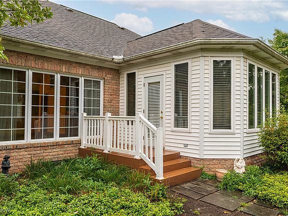 Rare opportunity in the Villages of Washington Square. Quality, brick free standing villa on cul-de-sac w/absolutely gorgeous views of walking & biking trail. This property was built by Alpha Construction. Open & flowing floor plan. Beautiful Great Room features cathedral ceilings & gas fireplace, including window views of gorgeous lot. Dining Room w/hardwood floors & crown molding. Pretty kitchen is open & looks out over Great Room; features Corian counters, appliances, hardwood floors, tile backsplash. Enter through kitchen into enclosed glassed/screened porch surrounded by windows overlooking wooded privacy & the walking/biking trail. Rear access from the porch to small deck/backyard. This home boasts a split bedroom plan; Owners' Suite off of rear hallway (hardwood floors) has oversized walk-in closet w/shelves, in addition to spacious bath w/double sinks, shower, & first floor laundry. At the other side of home near the Great Room is the second bedroom, an office/den (with closet) has blt.in desk & shelves. Second full bath nearby. Home also features half bath, & oversized double garage w/hot/cold water. Full, unfinished basement w/glass block windows, water softener, & built in cabinets/shelving. Wonderful location near Washington Square, Gervasi, restaurants, Walsh University; convenient to everything.