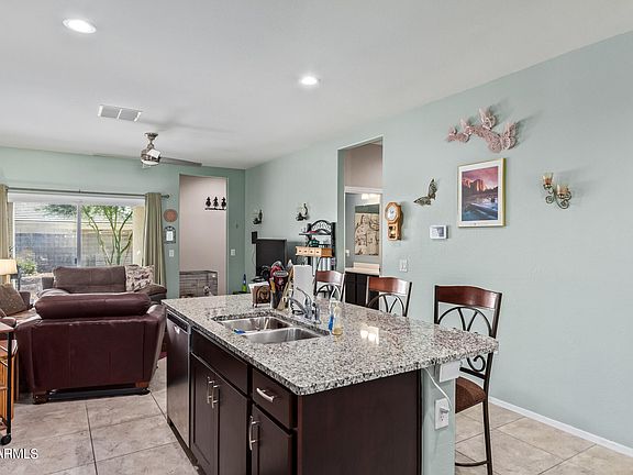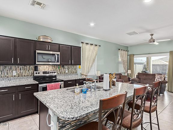 This beautiful North/South-facing home offers 3 bedrooms, 2 bathrooms, and a formal dining room. At the heart of the home, you'll find an open-concept great room and a stylish chef's eat-in kitchen. Featuring granite countertops, dark cabinetry, and an island with undermount lighting, this kitchen blends modern elegance with practicality. The home's sophisticated look is enhanced by wood-like tile flooring throughout, while a smart thermostat ensures efficient climate control.Outside, enjoy the surrounding green belts and breathtaking mountain views that complete the serene atmosphere of this move-in-ready home.