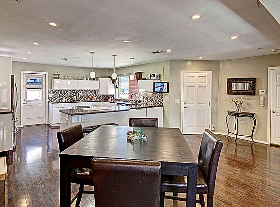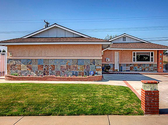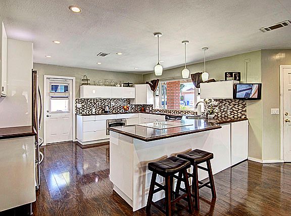 GORGEOUS MODERN HOME! VERY HIP!! Wonderful open floor plan with beautiful wood laminate floors throughout. Stunning kitchen offers sleek cabinetry, granite counters with glass back splash, stainless steel appliances including LG convection oven, cooktop, microwave and dishwasher plus breakfast bar and video door monitor. Living room has focal point tiled fireplace, recessed lighting and sliding glass doors to entertainers rear yard with stamped concrete 3- tiered patio with gas/electric connections! Spacious master bedroom has french doors leading to patio. .perfect spot for a hot tub! Huge walk-in closet with all built-ins. Both bathrooms have been completely remodeled. Inside laundry area. Garage has been dry-walled and insulated with electrical outlets making it the perfect playroom, gym or original garage. Extras include central a/c, automatic sprinklers front and rear, dual paned windows, updated electrical panel, extensive slate and brick work and SO much more!! Don't miss this fantastic home!