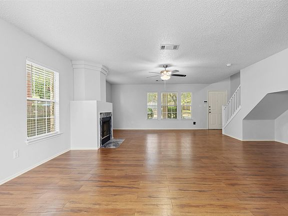 No Carpet Here! This spacious four-bedroom home features handsome laminate flooring! Enjoy an abundance of natural light in the sunny breakfast and kitchen areas. The kitchen comes with a refrigerator included and boasts a large walk-in pantry. Relax in the inviting Great Room with a cozy fireplace, perfect for gatherings. All bedrooms are upstairs, and each offers a walk-in closet and ceiling fan. The oversized primary suite includes space for a sitting area and a huge walk-in closet that feels like its own room. This move-in-ready gem!