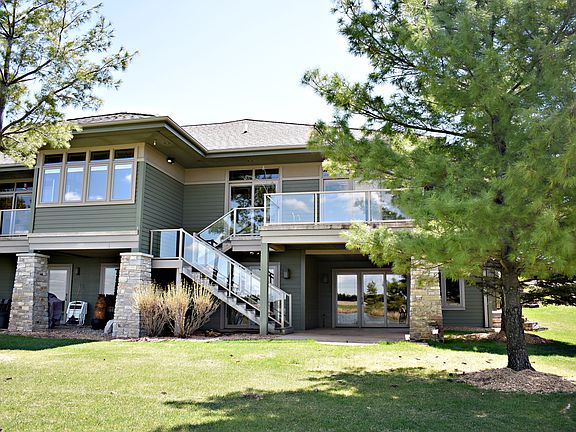 Waterfront Executive Condo...When Only The Very Best Will Doll! Strategically nestled in for privacy, coming home will have you feeling peaceful. Covered porch greets you or your guests while sheltering from any inclement weather that Mother Nature may bring. Upon entry, you will be enveloped into the rich hand crafted cherry woods, heated tile floors & a vaulted ceiling open concept living area. From morning to evening, relaxation or entertaining will be enjoyed in the spacious dining area, kitchen breakfast bar or in front of the ornate gas log fireplace in the great room. Your kitchen is ready for a quick meal on the go or a holiday feast featuring granite countertops, double ovens, built in microwave & cutting boards, side by side refrigerator, soft touch drawers & walk in pantry. Off of the kitchen is bonus room which could be an office or bedroom as well. You can retreat to the tranquility of your 4 seasons room w/concrete deck overlooking Prairie Lake where sunsets will amaze you. Your master bedroom also has access to the deck & features tray ceilings & a master bath you willlove featuring a Jacuzzi tub, tiled shower, 2 sinks & walk in closet. Full bath off the kitchen & mud room. Laundry/mud room comes complete w/built in bench & storage. 2 car oversized finished garage w/hot & cold water faucets are a plus. Need more room for family or guests? Your finished lower level is sure to please. Wrapped in decorative light bearing windows & walk out to patio overlooking your sandy beach, this family room also has it's own ambiance giving gas log fireplace. Bedroom w/patio access & another full bath! Geo-thermal heating & cooling, skylights & solid construction make this an easy decision. You've worked hard - come home to the care free condo living you deserve!