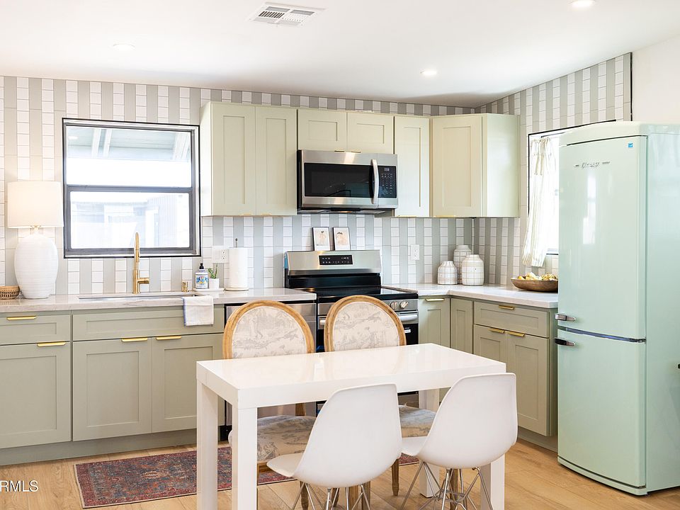 In this remodel every element was carefully considered: sage cabinetry paired with brass fixtures, geometric designer tile that makes a statement, natural light flooding through the kitchen, a cozy brick fireplace for cooler evenings, quartz countertops, black matte hardware, and a charming front porch with exposed beams showcase the quality throughout. The permitted guest house is a fully realized space with its own bath, mini-split HVAC, and private pavered patio. Clean lines, fresh paint, and thoughtful design make it move-in ready for guests or long-term tenants. The converted shipping container serves as a modern flex space with its own kitchenette. Currently set up as an office, it could easily transform into an art studio, workshop, home gym, or even a third income stream. Industrial-chic aesthetic matched with functionality.