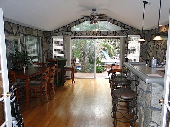 A wonderful opportunity to play where you stay - big open ranch with recreation room view of outdoor living space with palm tree and pond. Updates include custom stonework, bar, outdoor access bath, and a company sized kitchen. Take advantage of this great price now, then add your finishing touches.