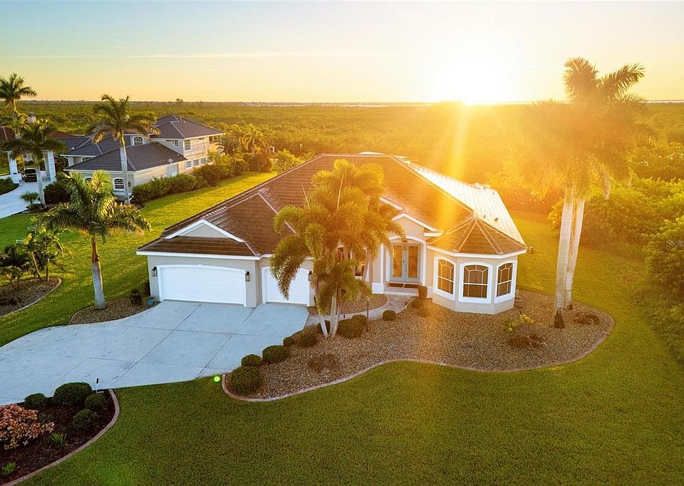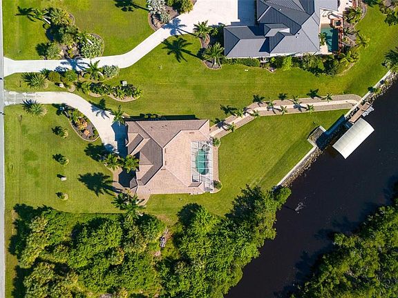 Embrace the art of coastal living at 19023 Midway Boulevard. A residence where refined design meets the freedom of water. Nestled on nearly an acre with 186 feet of sailboat-ready canal frontage, this home offers direct passage, with no bridges, to Charlotte Harbor and Gulf waters within minutes. A new paver walkway leads to the waters edge with direct boating access and an oversized dock with 16,000 lb. lift. Inside unfolds a gracious open plan, anchored by a dramatic great room crowned with a 12-foot coffered ceiling and a seamless zero-corner slider that erases the boundary between interior and lanai, while the expansive windows showcase the water from nearly every room. Overlooking the great room and open to the dining area, the chefs kitchen dazzles with new Cambria quartz counters and Thermador appliances, perfect for entertaining. When it's time to retire for the evening, there are 4 bedrooms, 3 full baths, including a generous primary suite and an inviting guest suite with private bath - each with access to the lanai and sparkling saltwater pool and spa. Located near the end of a quiet, private cul-de-sac, this home is secluded, but just minutes to fine dining, shopping, and major roadways. This exceptional property blends elegance, comfort, and the ultimate Florida lifestyle. *Please inquire about the assumable VA loan at 3.25%!!
