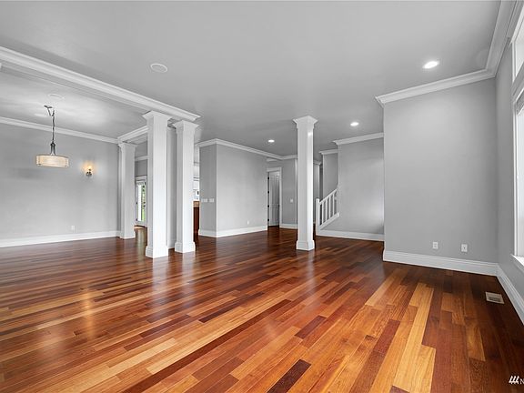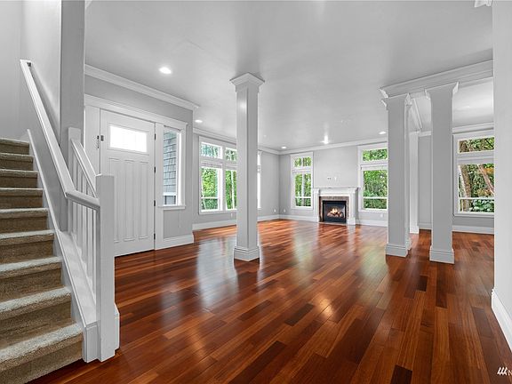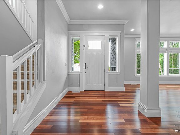 Pacific NW craftsman style home. 4 Beds 3.5 baths, 2 primary bedrooms with attached baths. 1 on the main floor w/an extra generous sized primary bedroom with a 5 piece bath, spa tub, walk-in closet & new carpets. Then 1 on the 2nd level w/an attached full bath & new paint. Also 2 additional large bedrooms each with walk-in closets, full bathroom. High open ceilings, beautiful craftsman woodwork, warm gas fireplace, gorgeous Brazilian hardwood floors, open chefs kitchen w/2 ovens, walk-in pantry, formal dining room, breakfast nook, private office with new carpet, guest bath powder room, views to the large private backyard, beautiful landscaping, sprinkler system, garden/storage shed & ceiling speakers for the music lovers!