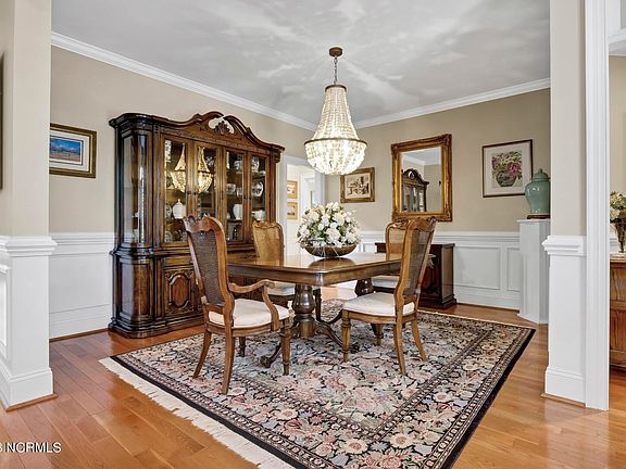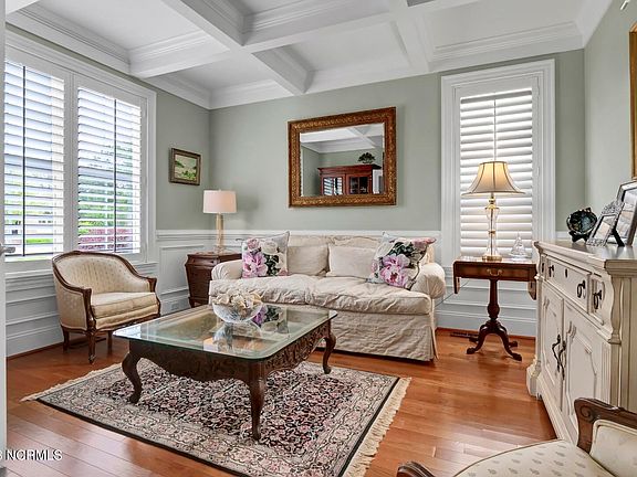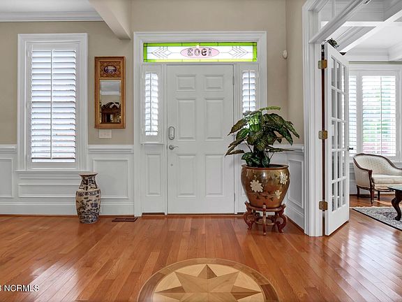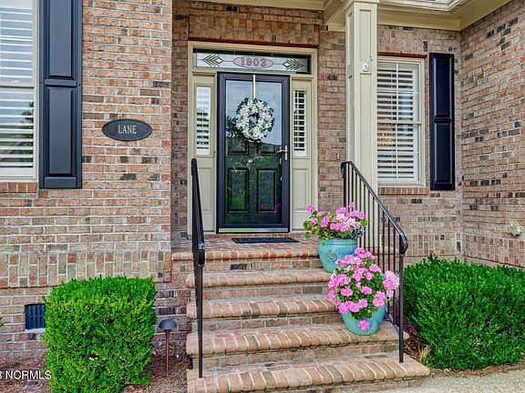 Welcome to the exclusive community of Landfall situated between Wilmington's finest shopping and dining locations and just over the bridge from beautiful Wrightsville Beach. 1903 Edgemont Ln. is a standout home which boasts the best of both worlds, quality and quantity! The craftsmanship and attention to detail is evident from the chair rail and wainscoting that flows from room to room and up the stairs, coffered ceiling in the study and crown molding in nearly every room! The huge kitchen featuring warm wood cabinets, Wolf gas cooktop, pot filler, and brand-new dishwasher connects to the living room with soaring 2 story ceiling. Enjoy the outdoors on your spacious covered terrace with outdoor speakers, insulated beadboard ceiling and extended lower patio for barbeques (yes, the Napoleon grill stays!) The hardwood flooring continues through the large main level primary bedroom where you'll find his and hers walk in closets with upgraded closet systems, upgraded vanities and counter tops, jetted tub, frameless walk-in shower with tile work extending onto the ceiling. Upstairs is perfect for family and friends. 4 additional bedrooms and 3 full baths, bonus room over the garage with dormer upgrade, plus home office with extensive built in cabinetry. Everyone has his own space! New roof in 2022, home entertainment package, plantation shutters throughout, HOA maintained lawn, 24hr gated security, and optional country club of Landfall membership will enhance carefree coastal lifestyle.