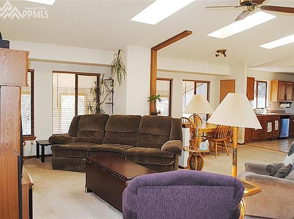 Spacious custom home rancher located in the heart of Erindale with pine trees and scrub oak galore! Main level has 3 bedrooms, living room, dining room, foyer, a larger, eat-in kitchen, and laundry. Plus 3 more bedrooms and bonus rec room and bar in the walkout basement with sunroom tiled addition. Great deck with views of Pikes Peak. Stucco and cedar siding with a new designer shingle roof. Open and airy interior with vaulted ceilings, soles panel powered venting skylights, high efficient furance, Central A/C and new cork wood flooring.