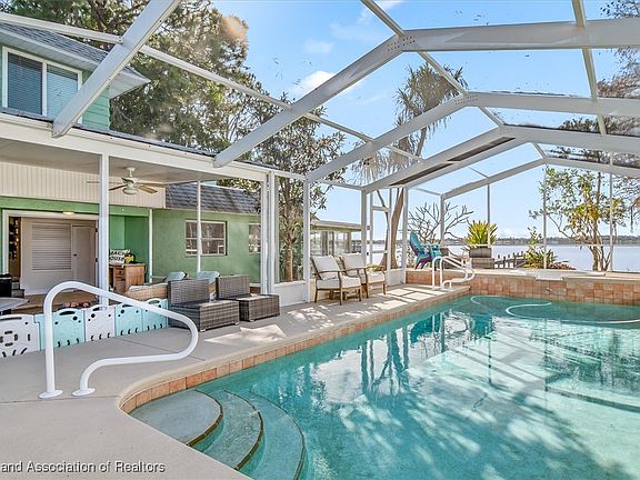 LAKEFRONT, POOL HOME - Enjoy the lake life in this 3 bedroom, 2 bath, two-story home situated on a deep lot with circular driveway, detached 2-car garage + carport, 2024 roof, and 88 feet of Lake Sebring frontage. The main floor features an open concept living room with stone fireplace, enclosed sun room, large remodeled kitchen open to the dining room, inside laundry room, and a large bathroom. The three spacious bedrooms are upstairs, two overlooking the lake with gorgeous views, and another large bathroom. Step outside to discover your own private oasis. You're going to love the covered lanai/patio for relaxing, and the screen enclosed pool and spa for entertaining. Plus, the long dock and cleared lakefront lawn to enjoy fishing, water sports and beautiful sunset views! Lake Sebring is a 468 acre muck bottom lake, perfect for all your water activities. This home is situated in a desirable area, close to everything, while providing a peaceful retreat. It's not just a home, it's a lifestyle...come live it!