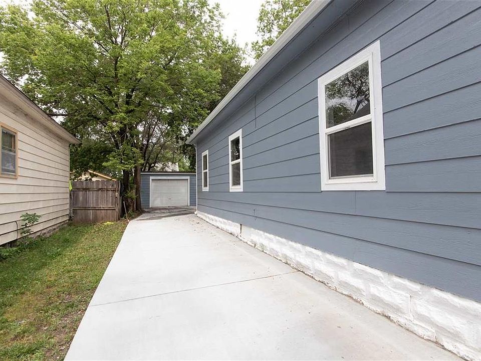Single floor - 756 sqft, 2 bdrm, 1 bath, detached 1 car garage w/selves. Long driveway and covered porch great for sunset watching.