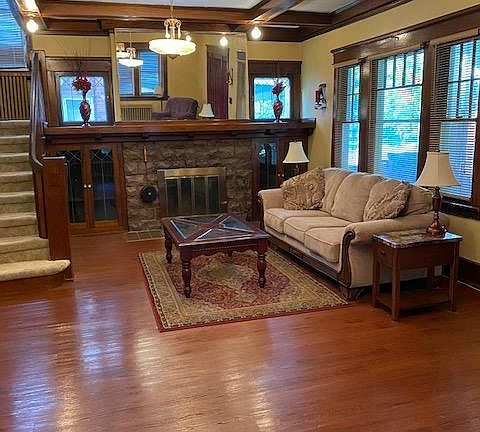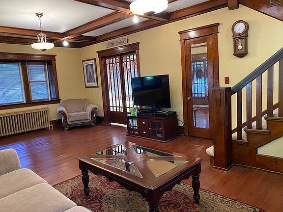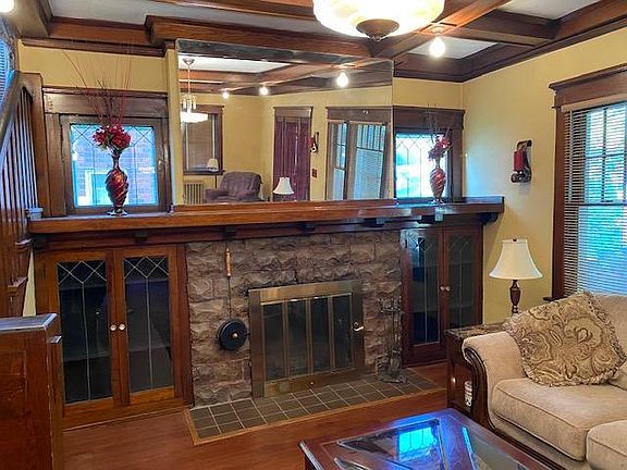 Beautiful Craftsman Style Bungalow bursting with old world charm including coffered ceilings, original lighting, beleveled glass french doors and gorgeous natural woodwork throughout. This home offers all 3 bedrooms on the 2nd level along with a large full bath. Two of the bedrooms are adjoined by a fabulous sunporch perfect for a playroom or sitting area! Newer roof, water heater and vinyl windows. Appliances, Olhausen brand pool table, and some furniture is included! Do not delay! Make this your new address today!