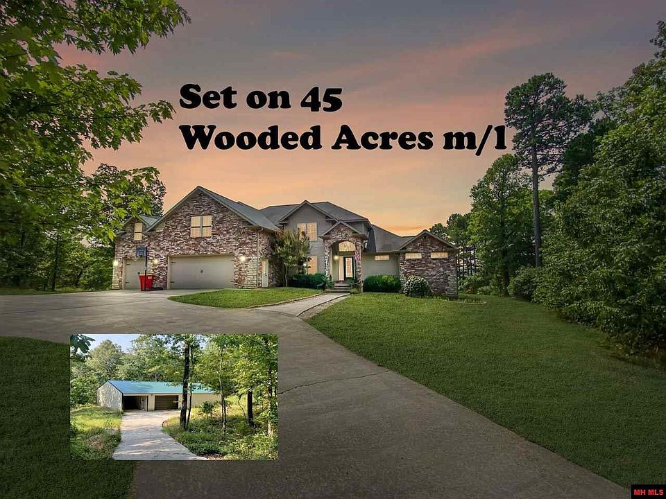 SET ON 49 WOODED ACRES M/L on paved road. This custom built 4 BR home has great room concept, open living room. Large 15'5x17'3 master suite w/outdoor hot tub and indoor glass bock shower and whirlpool tub. Family room with pool table included, separate office, and library. Unfinished basement area for your hobbies plus 3 outbuildings for all your toys. Joins Gov't strip on Lake Norfork. Has a large fruit orchard.