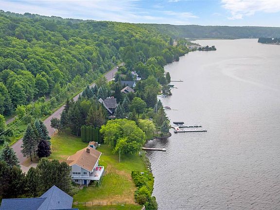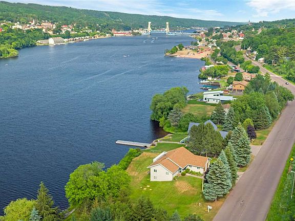Park your choice of watercraft at the newly refurbished dock, which gives you access to Portage Lake and beautiful Lake Superior. Enjoy spectacular water views from the living room, dining room and kitchen of this meticulously maintained 3 bedroom home. The kitchen has ample counter and cupboard space as well as a desk area. There are eight foot sliders in both the kitchen and dining room which lead to a 12' x 32' deck. Living Room features a vaulted ceiling and brick fireplace with built-in shelves on one side. Canal views from a spacious master bedroom with master bath that has a double vanity sink, walk-in shower and jetted soaking tub. The 8' x 12' walk-in closet is to be envied by anyone. Leaded glass window accents the staircase that brings you down to the large family room with a wood burning fireplace and a 12' sliding patio door overlooking the water. Two more bedrooms with water views, a full bathroom, cedar lined closet, a wood fired sauna and changing room with shower makes a phenomenal lower level that is ideal for guests. Generously sized storage room with work bench and a full wall of built-in shelving make a wonderful hobby room complete with waterfront views and exterior entrance. The oversized attached two car garage is heated and the exterior of the home and deck were painted in July, 2019.