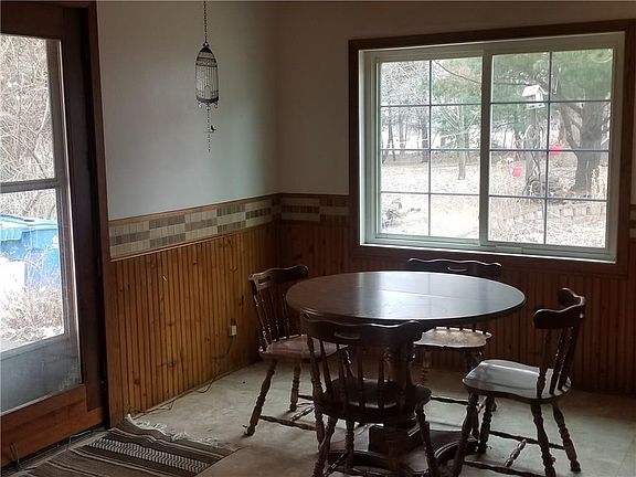 Country Living At It's Best. Ranch style 3 Bedroom, 1 Bath home nestled in the woods. Updated kitchen and Dining Room. Large Living Room. Master Bedroom with double closet. Main floor laundry. Park like setting with mature trees, flowers and pond surrounding detached deck. Outside Sauna. 2 car detached garage. Large 42X24 Building w/ loft, 14 ft. sidewalls and 12 ft. door with workshop. Newer Expensive Spray foam insulation throughout building. Great Views. Within minutes from Rice Lake.