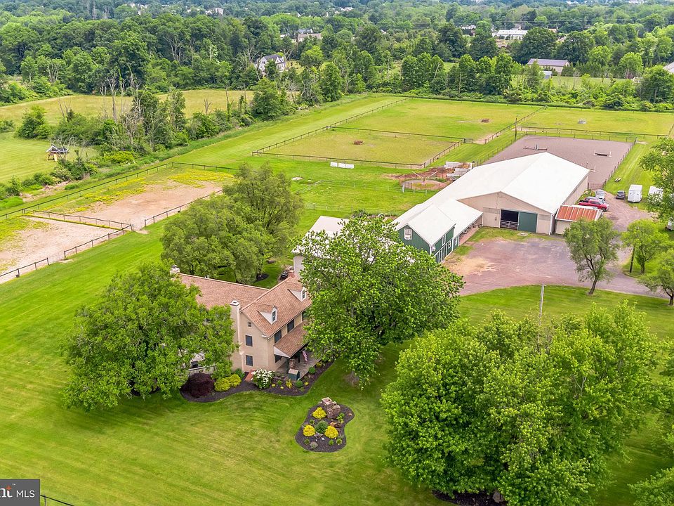 This enchanting farmhouse boasting an exceptional front porch is poised on nearly 13 acres in Hilltown Township and attractively blends the charm of the original 1780 house with a functional floorplan necessary for today’s lifestyle. During the planning of the addition and renovation of the existing home, every effort was made to preserve the old-world charm of the original house. Wide-plank yellow pine flooring, deep window sills and all the nooks and crannies expected in a residence of that era can still be found. The living room, with its beautiful stone fireplace and wood insert, and the dining room, ,with its built-in mirrored serving cabinet and two large closets, both have distinctive farmhouse ceiling beams. A remarkable floor-to-ceiling stone wall is the dramatic focal point of the kitchen. The kitchen also features solid cherry cabinets, granite countertops, stainless appliances, and a cheery breakfast area bright with many windows where the new homeowner will certainly enjoy a morning cup of coffee. The family room offers a traditional raised-hearth wood-burning stone fireplace and access to the deck. Watch your horses graze while barbecuing on the expansive secluded 530 sqft two-tiered side deck bordered by mature landscaping. A mudroom with washer, dryer and laundry tub is found on the barn side of the home, making it convenient to take off your barn boots and overalls before entering the main house. Ascending the turned staircase to the 2nd floor, double doors at the top of the steps open to a primary bedroom suite which has a spacious walk-in closet, a sizable bathroom with two sinks, Jacuzzi tub and separate shower. Three other bedrooms and full bath complete the 2nd floor. If anyone should require extra space for a playroom or storage, the walk-up attic is found in the back hallway of the original house and is just begging for your finishing touches. There isn’t an inch of carpeting in the home, which benefits those with allergies or pets. Very important updates and features not to be overlooked include a new roof on the house May 2024, new HVAC system 2022/2023, newer oil tank and heater flue, and an electronic dog fence allowing your pups six acres of freedom. This farm is an equestrian delight, as there is a 60’X120’ indoor arena, two tack rooms, 25 stalls, 7 which are heated, a kitchenette, nine pastures with solar-powered electric fencing, a round pen and hot walker. Tack up and enjoy the trail that surrounds the pastures! Aside from the couple of stalls occupied by the Sellers’ horses, the remaining stalls are leased. For those interested in this country setting but are not equine enthusiasts, the indoor arena doors open wide for those needing to store large equipment, hobby cars or a treasured boat. An additional shed can be found adjacent to the indoor, so equipment storage is not an issue. The heated/cooled 1.5 car garage is currently utilized as a workshop and features 220 three-phase electric, high ceilings and bright 8’ LED lighting; it is without question an ideal spot for working on your motorcycle or race car. Two one-bedroom apartments, one with an enclosed porch and the other with a bonus room, are located above the barn. There is ample parking in the front and around the side of the barn. This farm is located within 30 minutes of the Bucks County Horse Park, so trailering to the Thursday Morning Horse Shows or Tuesday Evening Dressage is convenient. It’s also just minutes to enjoy the loop around Lake Galena, or all the quaint shopping and terrific eateries found in Doylestown, Lahaska and New Hope. Pride of ownership is evident, as the current property owners have thoughtfully updated and lovingly cared for the house, barn, pastures and many horses over their 29 years. Be it your forever home or your weekend equine dream-come-true, this type of property is rarely offered and one not to miss. Act 319 preferential assessment. 24 hour notice required.