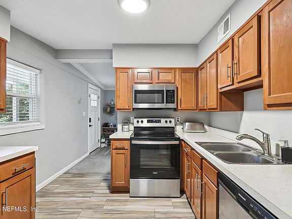 Affordable & Prime location between Atlantic and Beach Blvd - check out this adorable 3bed/1bath in Southside Estates. This single family home sits on a third acre with a large fully fenced back yard. The updated kitchen connects 2 flexible living spaces - perfect for dining or a second family room. The spacious Primary bedroom has a private exterior entry and walk in closet. The single bath includes a tiled shower tub combo and features an updated vanity and mirror. Utility closet with stackable washer and dryer located right off of the living room from interior of the home. Less than 10 minutes to UNF and the St Johns Town Center. Roof, HVAC and plumbing all updated in 2018! Water Softener included and sold AS IS. Schedule your showing today!