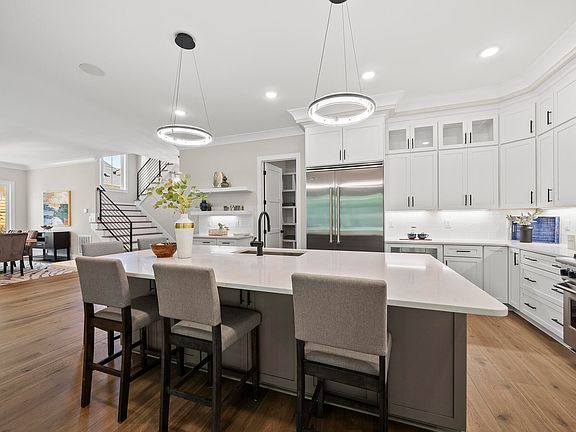 Custom-built by HJ Morris Construction. This stunning 4,546 sq ft home features a first-floor guest en-suite, chef's kitchen with ceiling-height white cabinetry, 48'' Viking gas range with double ovens, oversized quartz island, butler's pantry, coffee bar with floating shelves and walk-in scullery pantry. The kitchen opens to a spacious family room with dual sliders to a screened porch featuring a floor-to-ceiling brick fireplace. A tiled fireplace with built-ins anchors the family room, while a wet bar and open wine room with stained tongue-and-groove pine backer sit between casual dining and living. Upstairs, the luxurious primary suite boasts hardwoods, accent trim wall, dual custom closets, and a spa-like bath with a large tile-surround shower, bench, transom, dual shower heads, and double niches. A large rec room includes a dry bar and access to a balcony with metal railing. Wide-plank hardwood floors, elegant finishes, designer lighting, and a pool-ready lot complete this exceptional home.