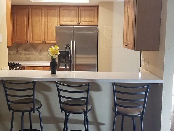 Upgraded Upstairs Unit 2+2 unit with balcony. Located in the front of the complex. Vaulted ceilings in living room and Master bedroom. Freshy painted throughout. Kitchen redone with wood cabinets, quartz countertops with nice size breakfast bar and chairs open to dining and living room, Stainless Steel appliances including stove/oven, microwave, dishwasher and refrigerator. Bathrooms both have beautiful lighting and gorgeous counters, new mirrors, newer tiled flooring. Laminate flooring in living, dining and hallway and bedrooms. Master bedroom features mirrored wardrobe door and private bathroom. One car garage with storage cabinets and one exterior parking space with the unit. Laundry in unit includes washer/dryer. Association has a Pool & Spa. Centrally located. Walking to Rancho Simi Community Park where the pond is and where there are free concerts in the park in the summer. Walk to Shopping (Smart and Final) or walk to dinner. It's rare to find such a wonderful home in an awesome location. HURRY THIS ONE WONT LAST! Visit Rentspree for the $49.99 application.