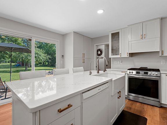 Farmhouse sinkLower levelPartially finished bathQuartz countertopsStylish kitchenNew cabinetryGorgeous bathroom