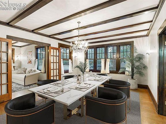 Gorgeous stunner in historic Old North End. This beautifully preserved property boasts original woodwork, beamed ceilings, builtins and light fixtures. Incredible elegance and charm throughout with french doors, high ceilings, wood burning fireplace and natural light. Remodeled kitchen with stainless steel appliances, quartz countertops, double ovens and eat in area. Spacious rooms with large closets. Lots of extras to include A/C, 2 car garage, jetted tub, ceiling fans, updated electrical panel, radon mitigation system, shed, additional storage room and workshop in basement. Low maintenance, xeriscaped yard. Enjoy summer nights on the large fenced in courtyard. Close to Downtown, parks, schools and restaurants.