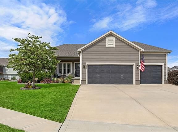 Only 4 years old & Better than New. Hard to find Newer Ranch with Beautifully Finished Basement! The kitchen, all 3 bathrooms and the wetbar All have granite counters. You'll love this open kitchen with seating at the island plus a dining area overlooking the nice back yard, Walk-in Pantry & All appliances. Fireplace with gas starter in the great room. The master suite has a double vanity, granite, walk in shower with seating and a walk-in closet. The master is on the opposite end of house from the other bedrooms. Laundry room & mud room area on main level. The basement has a spacious sized family room with a wet bar, 4th bedroom, the 3rd full bath & Cool stained floors! High quality blinds throughout the home. Good sized clean 3 car garage with epoxy floors. Lots of extra storage in basement with same epoxy floor as garage. Great covered deck with enclosed storage area under it. Covered front porch. Pretty landscaping in front & back yards. Located at the end of a cul-de-sac. The low HOA covers subdivision pool, playground & trails. Raymore-Peculiar schools. Just a couple minutes from Lee's Summit.