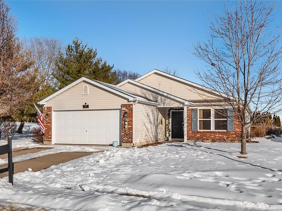 UPDATED, in an excellent location with the feel of country. Tastefully updated with the updates you need for modern style: water heater, new or updated trim, master bath & guest bath remodel, solar panels, kitchen update, lighting updates, fence addition, laundry room update, kitchen sink and more with floor replaced in recent years!  Easy one story living features open concept living, spacious kitchen with center island & large walk-in pantry, main floor laundry, den/office space, with 3 generously sized bedrooms and 2 full baths! Kitchen features modern lighting, butcher block, newer sink. 2 car garage has additional ceiling heat source. Large corner lot offers back patio with pergola and backs to an open field for privacy & relaxation. Located conveniently near walking trails, lake & convenient amenities: shopping, dining, entertainment and services nearby with short commute to Scott AFB base, recreation & St. Louis MO. Recent addition of solar panel lease keeps utility costs low!
